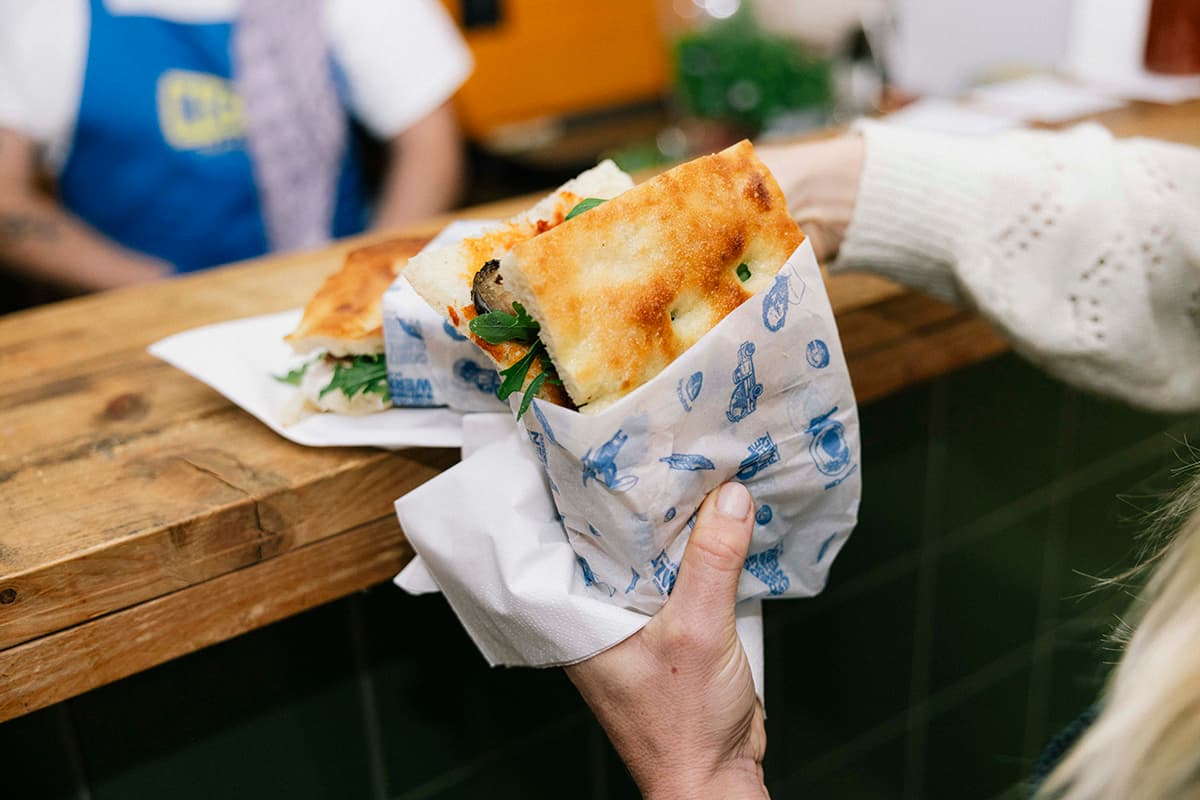 Focaccia met rucola, avocado, ei en bosui