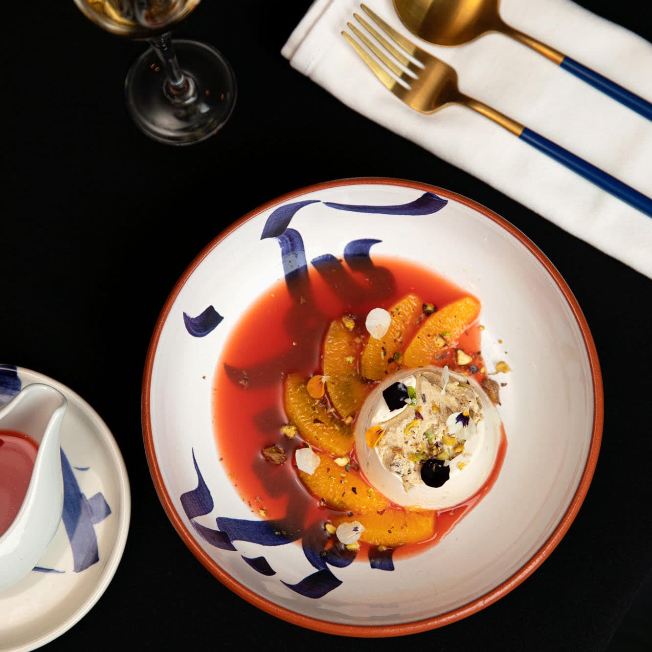 Chamia parfait: Chamia (sesampasta) met verse sinaasappel en een bloedsinaasappelsaus