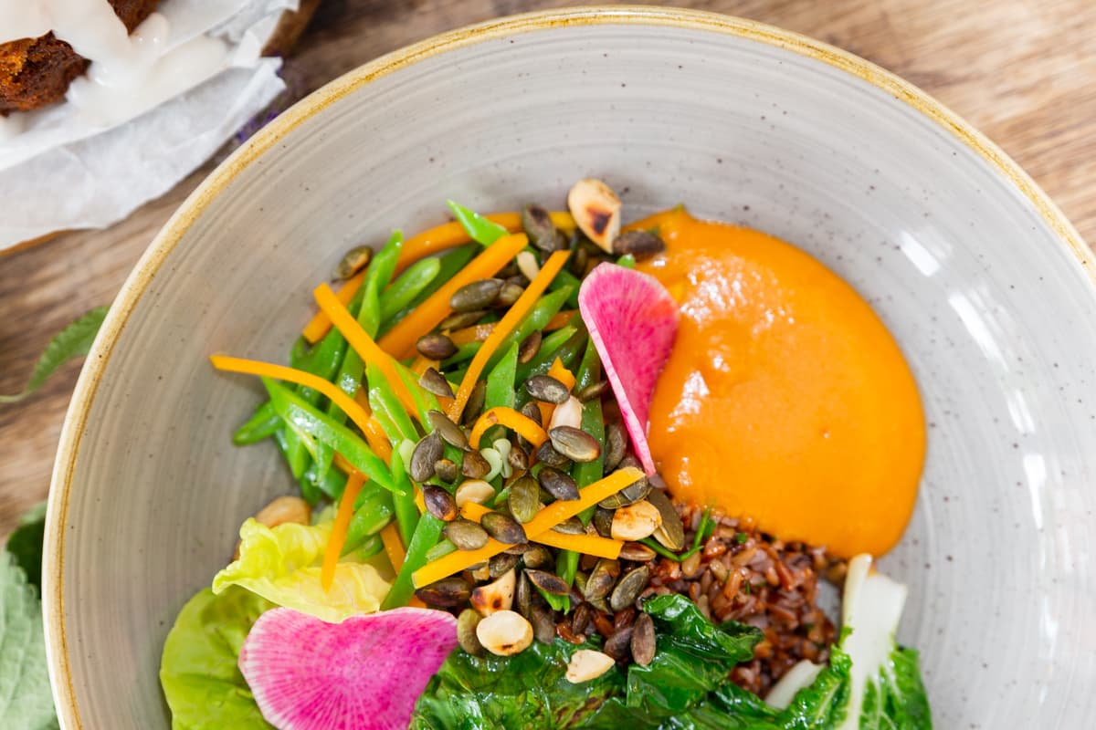 Dan begint de zoektocht naar een lekkere seizoensgroente om het gerecht aan te vullen. Kijk, snijbonen zijn de perfecte aanvulling. Ook gepickelde pompoen wordt toegevoegd aan het ingrediënten lijstje voor wat extra zuur. Het begint al een geheel te worden, maar er zijn nog wat laatste toevoegingen nodig. Een knapperige mini paksoi is bijvoorbeeld een goede aanvulling voor de aardse smaak van de rode rijst. Voeg daar nog red meat radijs aan toe. Deze is iets minder scherp dan de normale radijs en door de rode kleur ook een eyecatcher. Zeker niet onbelangrijk, het oog wil ook wat!